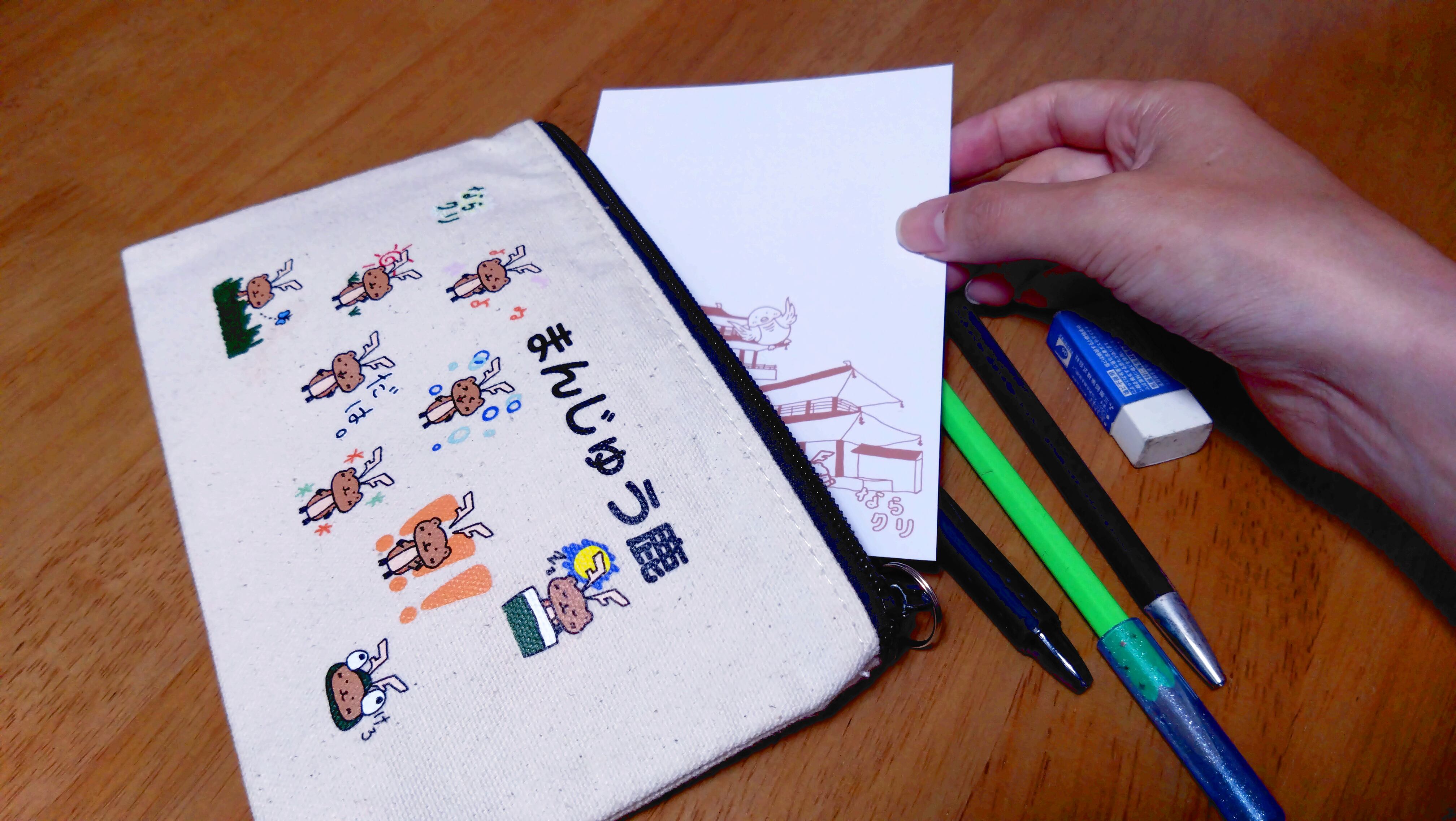 たくさんのまんじゅう鹿が描かれたポーチ。